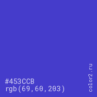 Цвет #453CCB в цветовой модели RGB обозначается тремя октетами (69, 60, 203) в десятичном формате и #453CCB в шестнадцатиричном (hex) формате, которые являются интенсивностью красного 69 (hex 45), интенсивность зелёного 60 (hex 3C) и интенсивность синего 203 (hex CB).