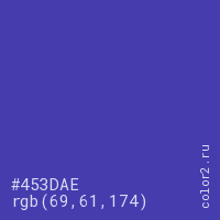 Цвет #453DAE в цветовой модели RGB обозначается тремя октетами (69, 61, 174) в десятичном формате и #453DAE в шестнадцатиричном (hex) формате, которые являются интенсивностью красного 69 (hex 45), интенсивность зелёного 61 (hex 3D) и интенсивность синего 174 (hex AE).