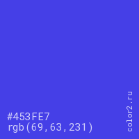 Цвет #453FE7 в цветовой модели RGB обозначается тремя октетами (69, 63, 231) в десятичном формате и #453FE7 в шестнадцатиричном (hex) формате, которые являются интенсивностью красного 69 (hex 45), интенсивность зелёного 63 (hex 3F) и интенсивность синего 231 (hex E7).
