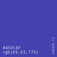 Цвет #4541AF в цветовой модели RGB обозначается тремя октетами (69, 65, 175) в десятичном формате и #4541AF в шестнадцатиричном (hex) формате, которые являются интенсивностью красного 69 (hex 45), интенсивность зелёного 65 (hex 41) и интенсивность синего 175 (hex AF).