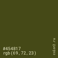 Цвет #454817 в цветовой модели RGB обозначается тремя октетами (69, 72, 23) в десятичном формате и #454817 в шестнадцатиричном (hex) формате, которые являются интенсивностью красного 69 (hex 45), интенсивность зелёного 72 (hex 48) и интенсивность синего 23 (hex 17).