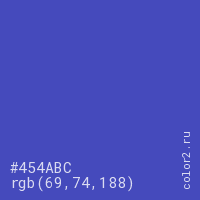 Цвет #454ABC в цветовой модели RGB обозначается тремя октетами (69, 74, 188) в десятичном формате и #454ABC в шестнадцатиричном (hex) формате, которые являются интенсивностью красного 69 (hex 45), интенсивность зелёного 74 (hex 4A) и интенсивность синего 188 (hex BC).