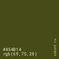 Цвет #454B14 в цветовой модели RGB обозначается тремя октетами (69, 75, 20) в десятичном формате и #454B14 в шестнадцатиричном (hex) формате, которые являются интенсивностью красного 69 (hex 45), интенсивность зелёного 75 (hex 4B) и интенсивность синего 20 (hex 14).