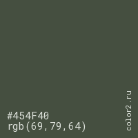 Цвет #454F40 в цветовой модели RGB обозначается тремя октетами (69, 79, 64) в десятичном формате и #454F40 в шестнадцатиричном (hex) формате, которые являются интенсивностью красного 69 (hex 45), интенсивность зелёного 79 (hex 4F) и интенсивность синего 64 (hex 40).