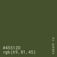 Цвет #45512D в цветовой модели RGB обозначается тремя октетами (69, 81, 45) в десятичном формате и #45512D в шестнадцатиричном (hex) формате, которые являются интенсивностью красного 69 (hex 45), интенсивность зелёного 81 (hex 51) и интенсивность синего 45 (hex 2D).