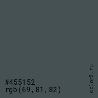 Цвет #455152 в цветовой модели RGB обозначается тремя октетами (69, 81, 82) в десятичном формате и #455152 в шестнадцатиричном (hex) формате, которые являются интенсивностью красного 69 (hex 45), интенсивность зелёного 81 (hex 51) и интенсивность синего 82 (hex 52).