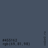 Цвет #455162 в цветовой модели RGB обозначается тремя октетами (69, 81, 98) в десятичном формате и #455162 в шестнадцатиричном (hex) формате, которые являются интенсивностью красного 69 (hex 45), интенсивность зелёного 81 (hex 51) и интенсивность синего 98 (hex 62).