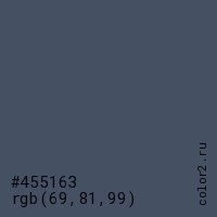 Цвет #455163 в цветовой модели RGB обозначается тремя октетами (69, 81, 99) в десятичном формате и #455163 в шестнадцатиричном (hex) формате, которые являются интенсивностью красного 69 (hex 45), интенсивность зелёного 81 (hex 51) и интенсивность синего 99 (hex 63).
