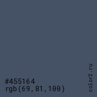 Цвет #455164 в цветовой модели RGB обозначается тремя октетами (69, 81, 100) в десятичном формате и #455164 в шестнадцатиричном (hex) формате, которые являются интенсивностью красного 69 (hex 45), интенсивность зелёного 81 (hex 51) и интенсивность синего 100 (hex 64).