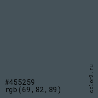 Цвет #455259 в цветовой модели RGB обозначается тремя октетами (69, 82, 89) в десятичном формате и #455259 в шестнадцатиричном (hex) формате, которые являются интенсивностью красного 69 (hex 45), интенсивность зелёного 82 (hex 52) и интенсивность синего 89 (hex 59).