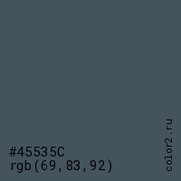 Цвет #45535C в цветовой модели RGB обозначается тремя октетами (69, 83, 92) в десятичном формате и #45535C в шестнадцатиричном (hex) формате, которые являются интенсивностью красного 69 (hex 45), интенсивность зелёного 83 (hex 53) и интенсивность синего 92 (hex 5C).
