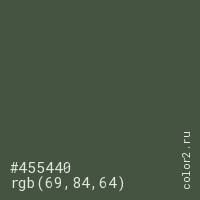 Цвет #455440 в цветовой модели RGB обозначается тремя октетами (69, 84, 64) в десятичном формате и #455440 в шестнадцатиричном (hex) формате, которые являются интенсивностью красного 69 (hex 45), интенсивность зелёного 84 (hex 54) и интенсивность синего 64 (hex 40).