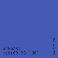 Цвет #455AB4 в цветовой модели RGB обозначается тремя октетами (69, 90, 180) в десятичном формате и #455AB4 в шестнадцатиричном (hex) формате, которые являются интенсивностью красного 69 (hex 45), интенсивность зелёного 90 (hex 5A) и интенсивность синего 180 (hex B4).
