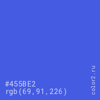Цвет #455BE2 в цветовой модели RGB обозначается тремя октетами (69, 91, 226) в десятичном формате и #455BE2 в шестнадцатиричном (hex) формате, которые являются интенсивностью красного 69 (hex 45), интенсивность зелёного 91 (hex 5B) и интенсивность синего 226 (hex E2).