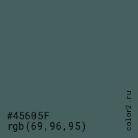 Цвет #45605F в цветовой модели RGB обозначается тремя октетами (69, 96, 95) в десятичном формате и #45605F в шестнадцатиричном (hex) формате, которые являются интенсивностью красного 69 (hex 45), интенсивность зелёного 96 (hex 60) и интенсивность синего 95 (hex 5F).