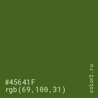 Цвет #45641F в цветовой модели RGB обозначается тремя октетами (69, 100, 31) в десятичном формате и #45641F в шестнадцатиричном (hex) формате, которые являются интенсивностью красного 69 (hex 45), интенсивность зелёного 100 (hex 64) и интенсивность синего 31 (hex 1F).