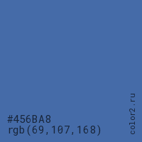 Цвет #456BA8 в цветовой модели RGB обозначается тремя октетами (69, 107, 168) в десятичном формате и #456BA8 в шестнадцатиричном (hex) формате, которые являются интенсивностью красного 69 (hex 45), интенсивность зелёного 107 (hex 6B) и интенсивность синего 168 (hex A8).