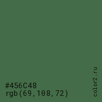 Цвет #456C48 в цветовой модели RGB обозначается тремя октетами (69, 108, 72) в десятичном формате и #456C48 в шестнадцатиричном (hex) формате, которые являются интенсивностью красного 69 (hex 45), интенсивность зелёного 108 (hex 6C) и интенсивность синего 72 (hex 48).