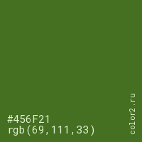 Цвет #456F21 в цветовой модели RGB обозначается тремя октетами (69, 111, 33) в десятичном формате и #456F21 в шестнадцатиричном (hex) формате, которые являются интенсивностью красного 69 (hex 45), интенсивность зелёного 111 (hex 6F) и интенсивность синего 33 (hex 21).