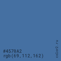 Цвет #4570A2 в цветовой модели RGB обозначается тремя октетами (69, 112, 162) в десятичном формате и #4570A2 в шестнадцатиричном (hex) формате, которые являются интенсивностью красного 69 (hex 45), интенсивность зелёного 112 (hex 70) и интенсивность синего 162 (hex A2).