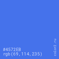 Цвет #4572EB в цветовой модели RGB обозначается тремя октетами (69, 114, 235) в десятичном формате и #4572EB в шестнадцатиричном (hex) формате, которые являются интенсивностью красного 69 (hex 45), интенсивность зелёного 114 (hex 72) и интенсивность синего 235 (hex EB).