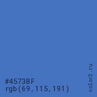 Цвет #4573BF в цветовой модели RGB обозначается тремя октетами (69, 115, 191) в десятичном формате и #4573BF в шестнадцатиричном (hex) формате, которые являются интенсивностью красного 69 (hex 45), интенсивность зелёного 115 (hex 73) и интенсивность синего 191 (hex BF).