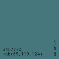 Цвет #45777C в цветовой модели RGB обозначается тремя октетами (69, 119, 124) в десятичном формате и #45777C в шестнадцатиричном (hex) формате, которые являются интенсивностью красного 69 (hex 45), интенсивность зелёного 119 (hex 77) и интенсивность синего 124 (hex 7C).