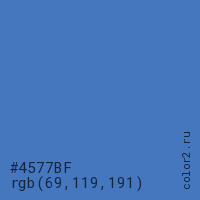 Цвет #4577BF в цветовой модели RGB обозначается тремя октетами (69, 119, 191) в десятичном формате и #4577BF в шестнадцатиричном (hex) формате, которые являются интенсивностью красного 69 (hex 45), интенсивность зелёного 119 (hex 77) и интенсивность синего 191 (hex BF).