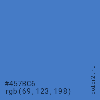 Цвет #457BC6 в цветовой модели RGB обозначается тремя октетами (69, 123, 198) в десятичном формате и #457BC6 в шестнадцатиричном (hex) формате, которые являются интенсивностью красного 69 (hex 45), интенсивность зелёного 123 (hex 7B) и интенсивность синего 198 (hex C6).