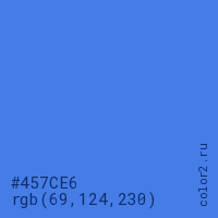 Цвет #457CE6 в цветовой модели RGB обозначается тремя октетами (69, 124, 230) в десятичном формате и #457CE6 в шестнадцатиричном (hex) формате, которые являются интенсивностью красного 69 (hex 45), интенсивность зелёного 124 (hex 7C) и интенсивность синего 230 (hex E6).