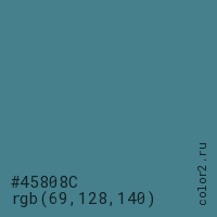 Цвет #45808C в цветовой модели RGB обозначается тремя октетами (69, 128, 140) в десятичном формате и #45808C в шестнадцатиричном (hex) формате, которые являются интенсивностью красного 69 (hex 45), интенсивность зелёного 128 (hex 80) и интенсивность синего 140 (hex 8C).