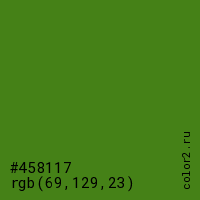 Цвет #458117 в цветовой модели RGB обозначается тремя октетами (69, 129, 23) в десятичном формате и #458117 в шестнадцатиричном (hex) формате, которые являются интенсивностью красного 69 (hex 45), интенсивность зелёного 129 (hex 81) и интенсивность синего 23 (hex 17).