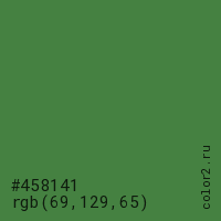 Цвет #458141 в цветовой модели RGB обозначается тремя октетами (69, 129, 65) в десятичном формате и #458141 в шестнадцатиричном (hex) формате, которые являются интенсивностью красного 69 (hex 45), интенсивность зелёного 129 (hex 81) и интенсивность синего 65 (hex 41).