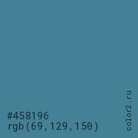 Цвет #458196 в цветовой модели RGB обозначается тремя октетами (69, 129, 150) в десятичном формате и #458196 в шестнадцатиричном (hex) формате, которые являются интенсивностью красного 69 (hex 45), интенсивность зелёного 129 (hex 81) и интенсивность синего 150 (hex 96).