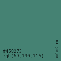 Цвет #458273 в цветовой модели RGB обозначается тремя октетами (69, 130, 115) в десятичном формате и #458273 в шестнадцатиричном (hex) формате, которые являются интенсивностью красного 69 (hex 45), интенсивность зелёного 130 (hex 82) и интенсивность синего 115 (hex 73).