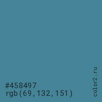 Цвет #458497 в цветовой модели RGB обозначается тремя октетами (69, 132, 151) в десятичном формате и #458497 в шестнадцатиричном (hex) формате, которые являются интенсивностью красного 69 (hex 45), интенсивность зелёного 132 (hex 84) и интенсивность синего 151 (hex 97).