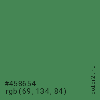 Цвет #458654 в цветовой модели RGB обозначается тремя октетами (69, 134, 84) в десятичном формате и #458654 в шестнадцатиричном (hex) формате, которые являются интенсивностью красного 69 (hex 45), интенсивность зелёного 134 (hex 86) и интенсивность синего 84 (hex 54).