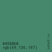 Цвет #45886B в цветовой модели RGB обозначается тремя октетами (69, 136, 107) в десятичном формате и #45886B в шестнадцатиричном (hex) формате, которые являются интенсивностью красного 69 (hex 45), интенсивность зелёного 136 (hex 88) и интенсивность синего 107 (hex 6B).