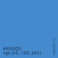 Цвет #458ACD в цветовой модели RGB обозначается тремя октетами (69, 138, 205) в десятичном формате и #458ACD в шестнадцатиричном (hex) формате, которые являются интенсивностью красного 69 (hex 45), интенсивность зелёного 138 (hex 8A) и интенсивность синего 205 (hex CD).