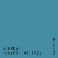 Цвет #458DA2 в цветовой модели RGB обозначается тремя октетами (69, 141, 162) в десятичном формате и #458DA2 в шестнадцатиричном (hex) формате, которые являются интенсивностью красного 69 (hex 45), интенсивность зелёного 141 (hex 8D) и интенсивность синего 162 (hex A2).