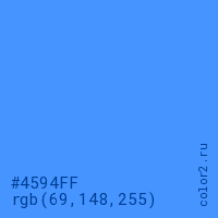 Цвет #4594FF в цветовой модели RGB обозначается тремя октетами (69, 148, 255) в десятичном формате и #4594FF в шестнадцатиричном (hex) формате, которые являются интенсивностью красного 69 (hex 45), интенсивность зелёного 148 (hex 94) и интенсивность синего 255 (hex FF).