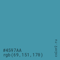 Цвет #4597AA в цветовой модели RGB обозначается тремя октетами (69, 151, 170) в десятичном формате и #4597AA в шестнадцатиричном (hex) формате, которые являются интенсивностью красного 69 (hex 45), интенсивность зелёного 151 (hex 97) и интенсивность синего 170 (hex AA).
