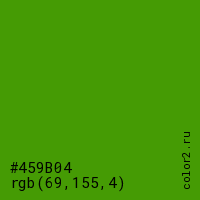Цвет #459B04 в цветовой модели RGB обозначается тремя октетами (69, 155, 4) в десятичном формате и #459B04 в шестнадцатиричном (hex) формате, которые являются интенсивностью красного 69 (hex 45), интенсивность зелёного 155 (hex 9B) и интенсивность синего 4 (hex 04).