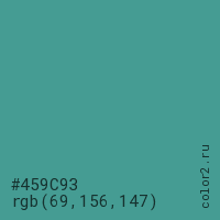 Цвет #459C93 в цветовой модели RGB обозначается тремя октетами (69, 156, 147) в десятичном формате и #459C93 в шестнадцатиричном (hex) формате, которые являются интенсивностью красного 69 (hex 45), интенсивность зелёного 156 (hex 9C) и интенсивность синего 147 (hex 93).