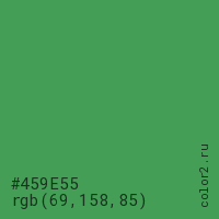 Цвет #459E55 в цветовой модели RGB обозначается тремя октетами (69, 158, 85) в десятичном формате и #459E55 в шестнадцатиричном (hex) формате, которые являются интенсивностью красного 69 (hex 45), интенсивность зелёного 158 (hex 9E) и интенсивность синего 85 (hex 55).