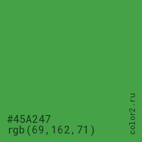 Цвет #45A247 в цветовой модели RGB обозначается тремя октетами (69, 162, 71) в десятичном формате и #45A247 в шестнадцатиричном (hex) формате, которые являются интенсивностью красного 69 (hex 45), интенсивность зелёного 162 (hex A2) и интенсивность синего 71 (hex 47).