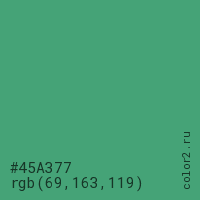 Цвет #45A377 в цветовой модели RGB обозначается тремя октетами (69, 163, 119) в десятичном формате и #45A377 в шестнадцатиричном (hex) формате, которые являются интенсивностью красного 69 (hex 45), интенсивность зелёного 163 (hex A3) и интенсивность синего 119 (hex 77).