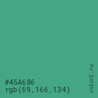 Цвет #45A686 в цветовой модели RGB обозначается тремя октетами (69, 166, 134) в десятичном формате и #45A686 в шестнадцатиричном (hex) формате, которые являются интенсивностью красного 69 (hex 45), интенсивность зелёного 166 (hex A6) и интенсивность синего 134 (hex 86).
