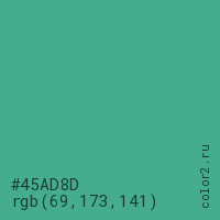 Цвет #45AD8D в цветовой модели RGB обозначается тремя октетами (69, 173, 141) в десятичном формате и #45AD8D в шестнадцатиричном (hex) формате, которые являются интенсивностью красного 69 (hex 45), интенсивность зелёного 173 (hex AD) и интенсивность синего 141 (hex 8D).