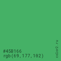 Цвет #45B166 в цветовой модели RGB обозначается тремя октетами (69, 177, 102) в десятичном формате и #45B166 в шестнадцатиричном (hex) формате, которые являются интенсивностью красного 69 (hex 45), интенсивность зелёного 177 (hex B1) и интенсивность синего 102 (hex 66).